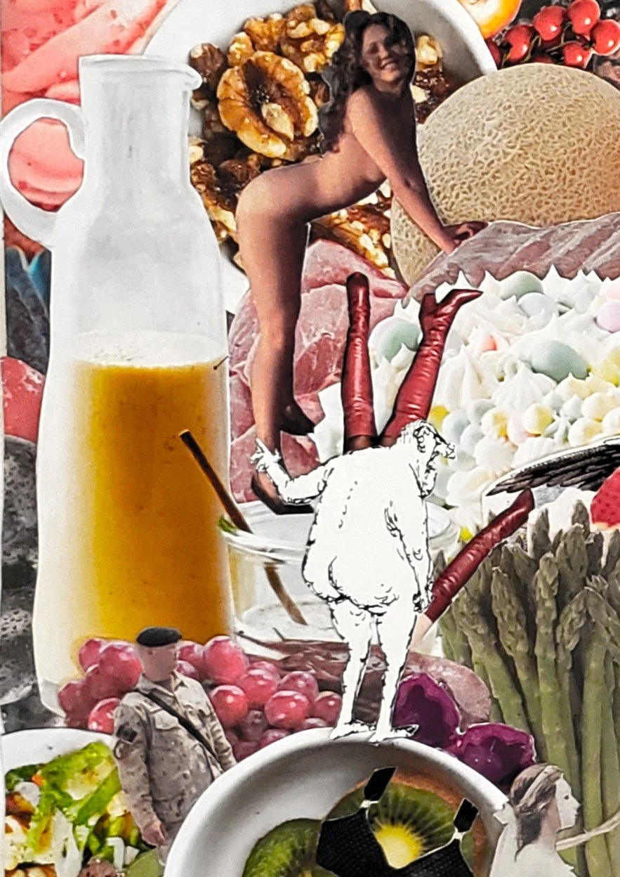 It’s a 16’x20’ analogue collage on un-stretched canvas comprised primarily of clips from vintage Playboy magazines and grocery store flyers.